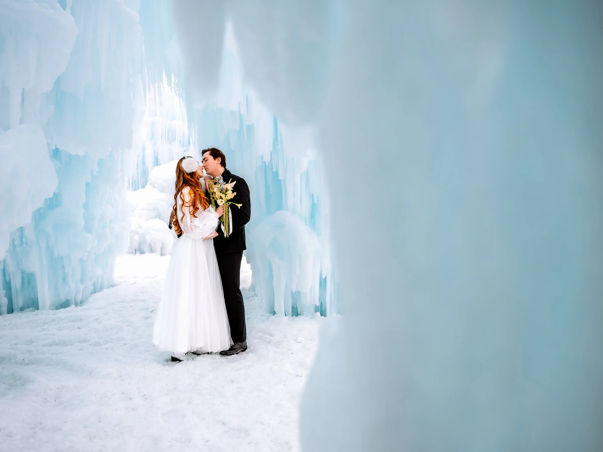 A woman with long red hair in a white wedding dress holding a bouquet of flowers in a snowy, icy environment with blue ice formations.
