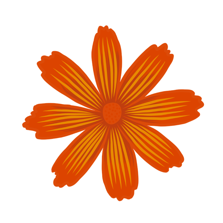 Digital illustration of an orange flower with elongated petals and striped details on a black background.