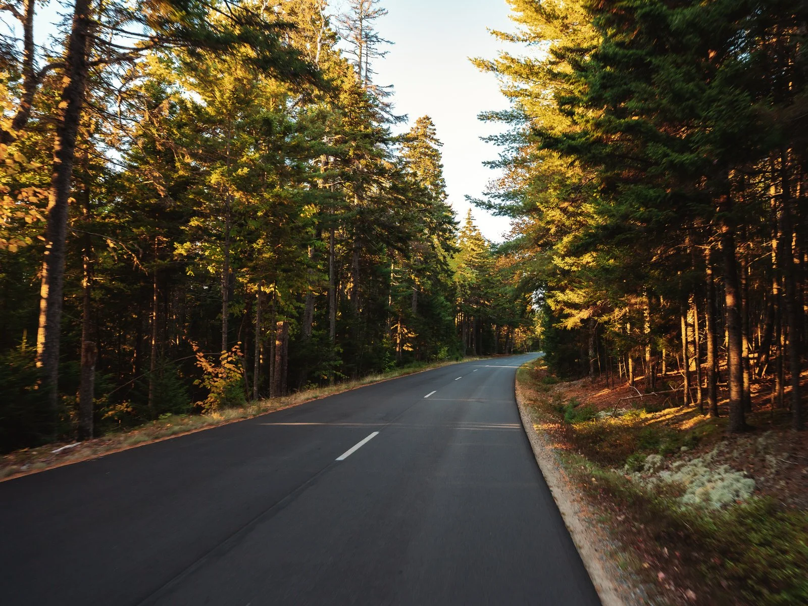 A winding paved road running through a dense forest with tall trees and green foliage, illuminated by sunlight.